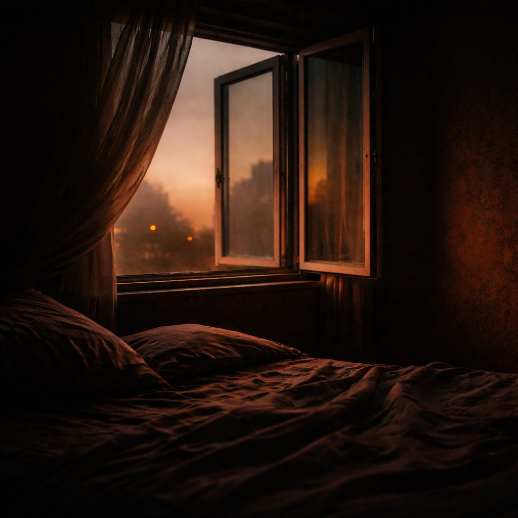 That is the detail that breaks me. Not the bed, not the nudity, but the breeze. It drifts in from the street, warm and indifferent, carrying the noise of a city that usually rejects me. But in here, the noise is soft. The defences are down.